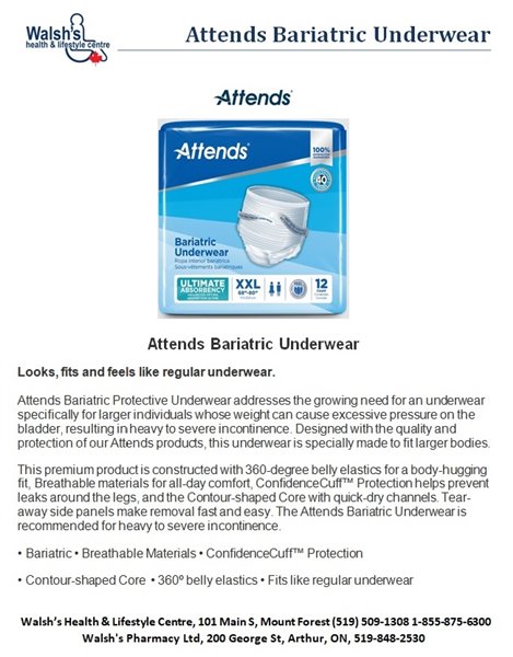 Looks, fits and feels like regular underwear. Attends Bariatric Protective Underwear addresses the growing need for an underwear specifically for larger individuals whose weight can cause excessive pressure on the bladder, resulting in heavy to severe incontinence. Designed with the quality and protection of our Attends products, this underwear is specially made to fit larger bodies.
