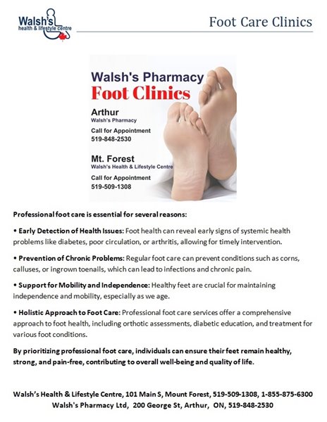 My name is Lisa, a specialized foot care provider based in Wellington North. I primarily offer my services in Mount Forest on Mondays and Tuesdays at Walsh's Health and Lifestyle Centre, and in Arthur on Thursdays at Walsh's IDA Pharmacy.
