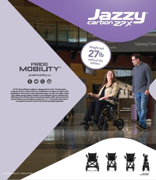 The Jazzy® Carbon 27X is a power wheelchair that folds vertically thanks to its innovative X-frame design. Weighing in at approximately 27.5 lbs. without the battery, it’s the ideal mobility device for journeys near and far.