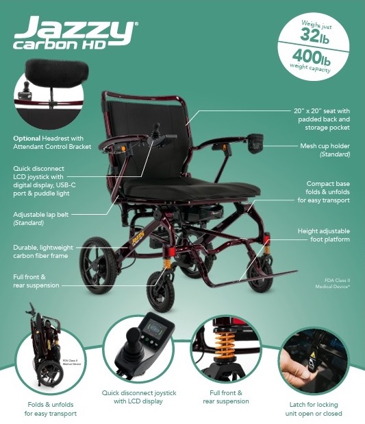 The wait is over for a travel friendly, heavy-duty, power wheelchair built for portability. The Jazzy® Carbon HD offers a 400-lb. weight capacity, weighs 32.2 lbs. without the battery, has a durable carbon fiber frame, and gives you a greater level of independence throughout your travels.