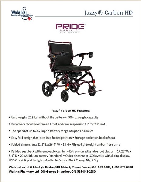 The roomy 20 x 20” seat, adjustable padded seat back, removable cushion, and extra-wide adjustable foot platform are designed for your comfort. It also has front and rear suspension providing a smooth ride over varied terrain. Jazzy® is known for world-class quality, a commitment to the industry’s most rigorous testing standards, and proven performance over three decades. You will get all of that with the Jazzy® Carbon HD! Travel worry-free and experience the best in lightweight portability!