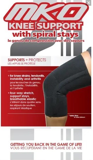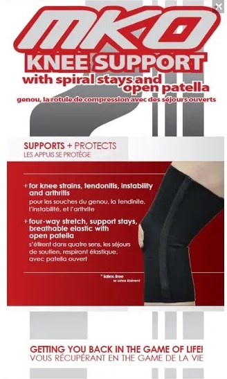 The MKO Knee Support with Spiral Stays is indicated for knee strains, tendonitis, instability, and arthritis. The spiral stays prevent garment rolling and migration. Increased comfort