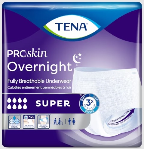 TENA ProSkin Overnight Super Fully Breathable Underwear quickly and efficiently draws moisture away from the skin, even with larger urine leaks, locking it deep inside the high-performance core for leakage security all night. Made of soft, breathable materials that helps promote skin health for medium to heavy night time incontinence.