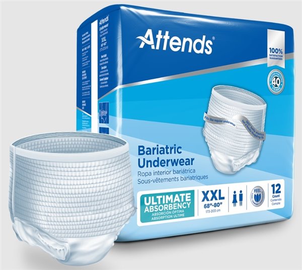Looks, fits and feels like regular underwear. Attends Bariatric Protective Underwear addresses the growing need for an underwear specifically for larger individuals whose weight can cause excessive pressure on the bladder, resulting in heavy to severe incontinence. Designed with the quality and protection of our Attends products, this underwear is specially made to fit larger bodies.