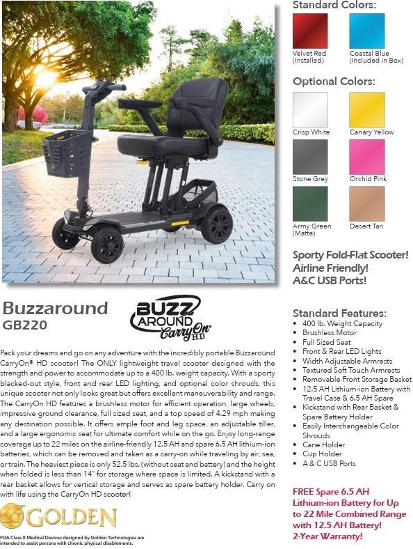 Pack your dreams and go on any adventure with the incredibly portable Buzzaround CarryOn HD Scooter.