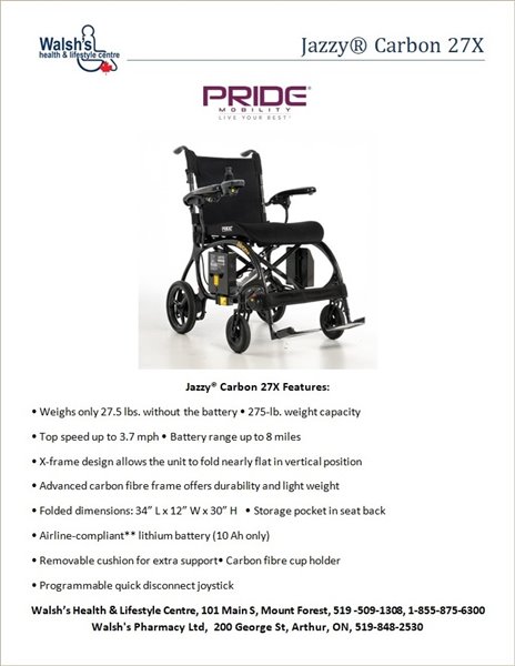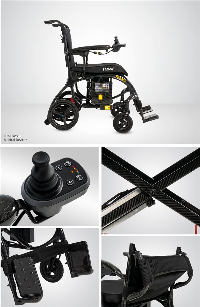 The Jazzy® Carbon 27X is a power wheelchair that folds vertically thanks to its innovative X-frame design. Weighing in at approximately 27.5 lbs. without the battery, it’s the ideal mobility device for journeys near and far.