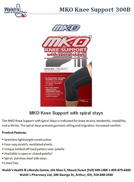 The MKO Knee Support with Spiral Stays is indicated for knee strains, tendonitis, instability, and arthritis. The spiral stays prevent garment rolling and migration. Increased comfort